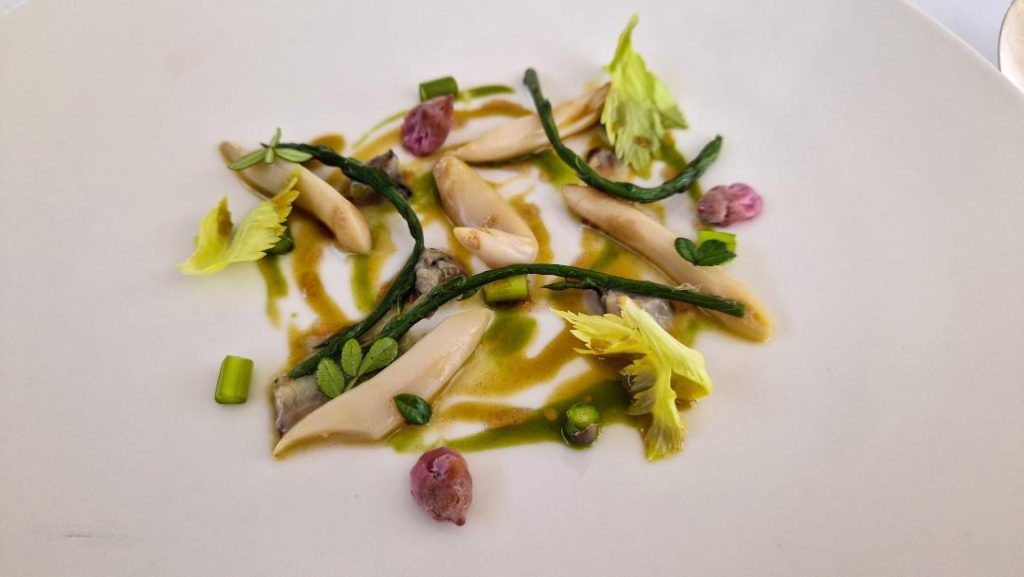 Cannolicchio, fiori di pesco, sedano, sugo di cannolicchio e olio di pepe di Siltimur