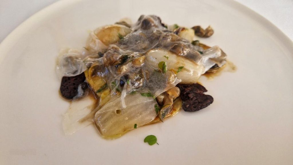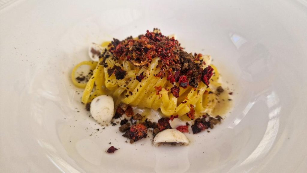 Il “Lab” è il menù annuale di Mauro Uliassi che cambia ogni anno: 10 piatti per non sedersi sugli allori, per stimolare ancora l’incontro tra ingredienti e visioni. Si parte con lo storico Wafer di fegato d’anatra, nocciole e shot di Kir Royal che apre il pranzo come un aperitivo stuzzicante per poi proseguire con la leggerezza dei piatti di mare come il Gambero rosso,curry verde, peperone e kaffir lime e il Cannolicchio, fiori di pesco, sedano, sugo di cannolicchio e olio di pepe di Siltimur che è rimasto impresso nella memoria per quello speciale sapore amaricante che ha sposato bene un Kerner 2024 di Manni Nossing. Davvero un ottimo piatto. Gli Spaghetti, burro, alici, luppolo e mirtilli sono stati il piatto confortevole, riuscitissimo, la coccola dell’esperienza che viene voglia di ritentare a casa.