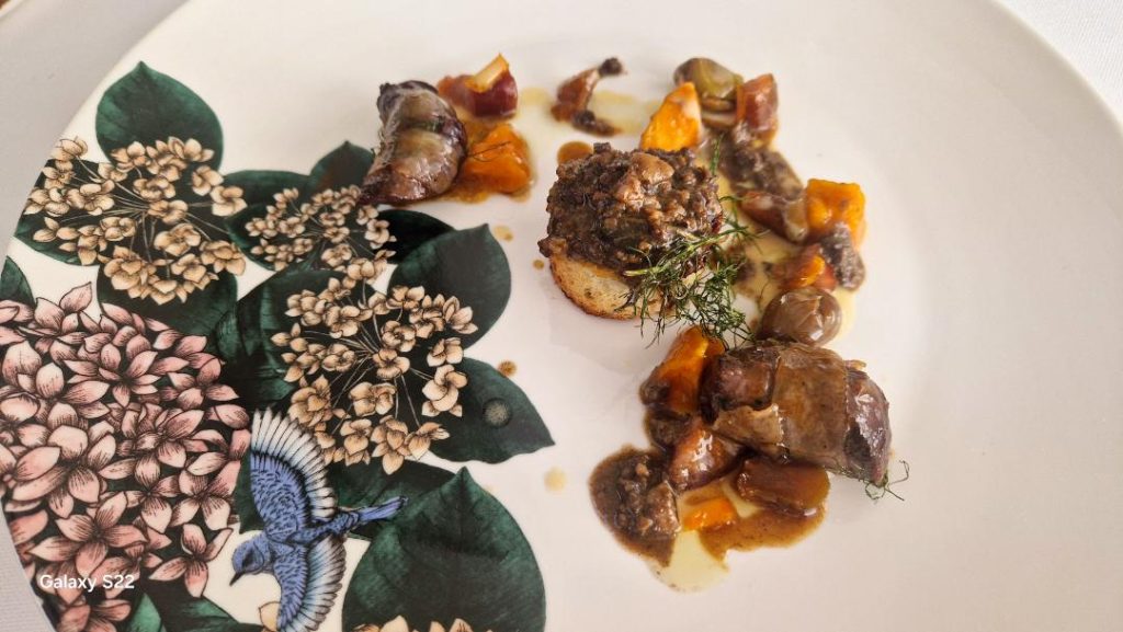 Dopo aver assaporato sapori così mutevoli viene servito un piatto di agrumi e cannella per rinfrescare la bocca e procedere con altre due portate “Mezzemaniche, caciopepe e pera” è un omaggio a uno dei piatti iconici della cucina italiana ma anche a un binomio tanto diffuso quanto misterioso: formaggio e pera. Infine il Colombaccio ai fichi e albicocche, un’esecuzione eccellente accompagnata da un crostino di interiora di colombaccio che ricorda il famoso patè di fegatini alla toscana.