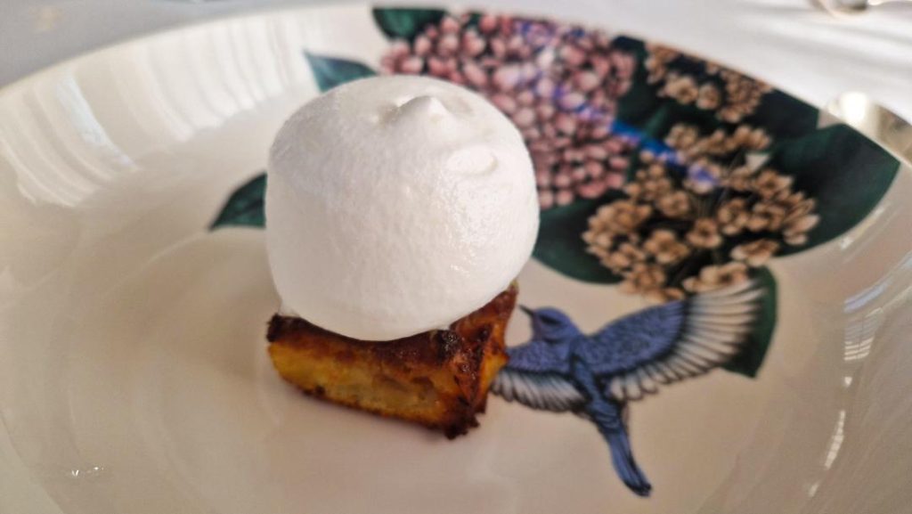 Con la Sogliola al pepe verde si vira su un sapore agro. I Bombolini in porchetta, patate e lardo sono stati un’altra chicca del pranzo: i bombolini sono le lumachine di mare e nella Riviera del Conero rappresentano una tradizione: in questa versione sono davvero succulenti e sembrano quasi ricordare le animelle alla brace.